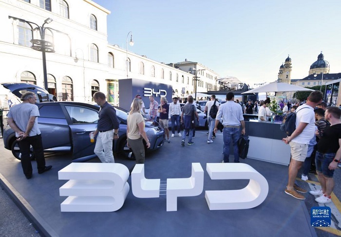 Besucher besichtigen auf der IAA Mobility 2024 die Autos des chinesischen Autoherstellers BYD. (5. September 2024, Xinhua)