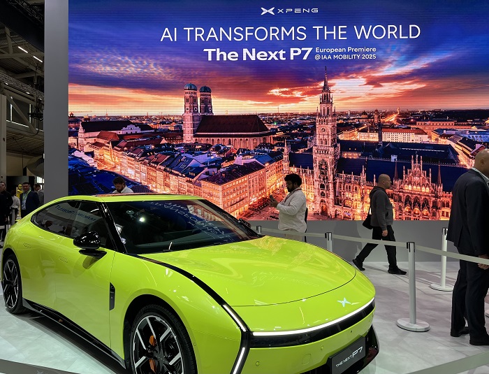 Beim Medientag der Internationalen Automobilausstellung 2025 in München: Die offizielle Eröffnung der Messe erfolgte einen Tag später, am 9. September, wobei auch chinesische Aussteller ihre Innovationserrungenschaften präsentierten. Das Bild zeigt die Europapremiere des brandneuen XPeng P7.
