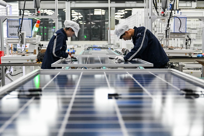 Mitarbeiter arbeiten an einer Produktionslinie für Photovoltaik-Module in einem Unternehmen in der nordchinesischen Stadt Ordos. (Xinhua)
