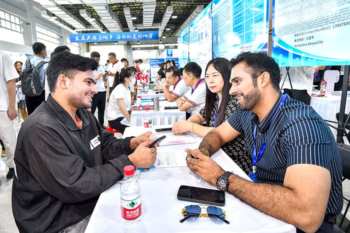 Bewerbungsgespräch auf einer Jobmesse in Haikou im Juli 2025: 280 Arbeitgeber aus Branchen wie Saatgutindustrie, Schiff- und Raumfahrt, Digitalwirtschaft und Tourismus hatten über 8300 Ste len für Fachkräfte ausgeschrieben.